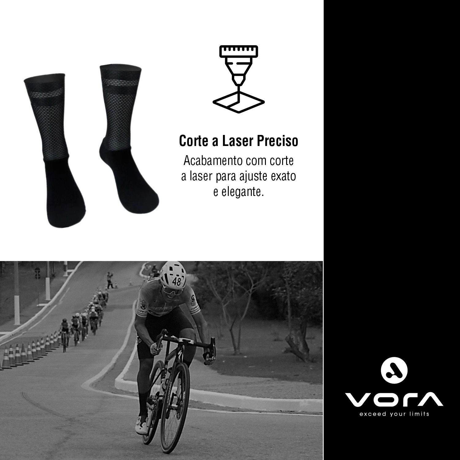 Meias de ciclismo elegantes e com bonito corte a laser, combina aerodinâmica e ventilação otimizada.